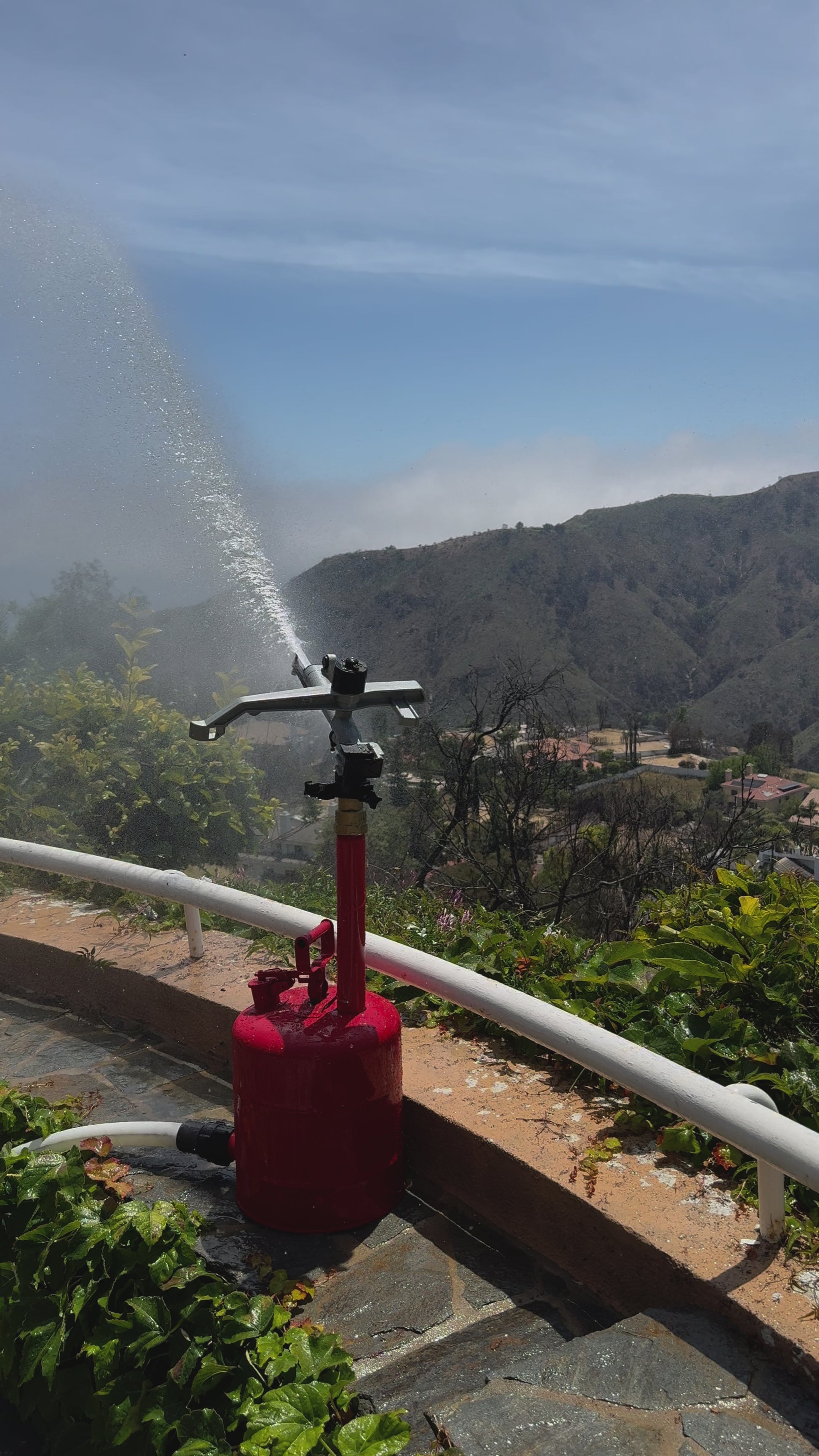 The Mobile Exposure Defender is designed to provide robust water delivered from our Urban Wildfire Defense Cart, then sprayed from a position that can be moved from location to location. Water is delivered via a 1.5" hose connected to a base pipe with a diffusion sprinkler head mounted on top. The Mobile Exposure Defender connects quickly to our Urban Wildfire Defense Cart.